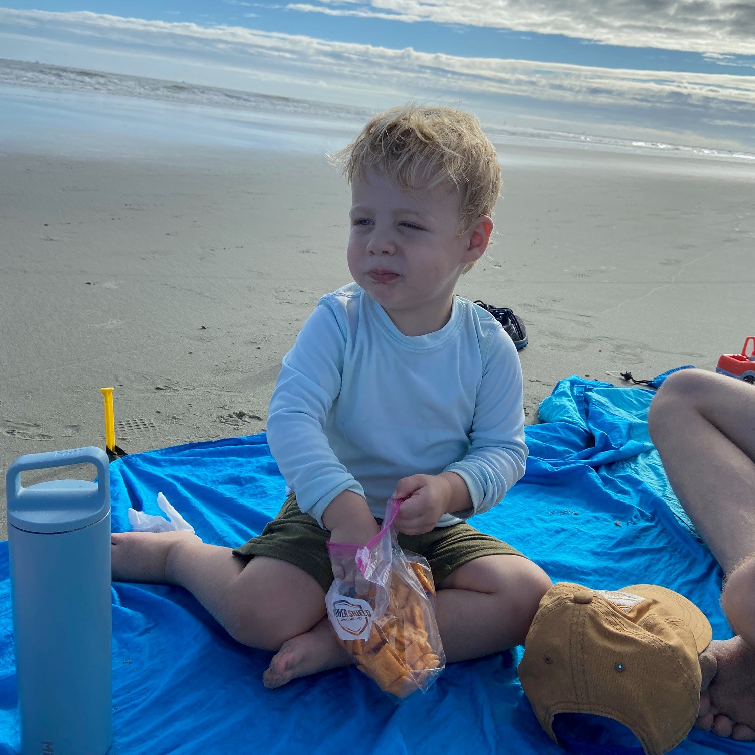 - Pack a beach picnic. We knew that the trek would be, let’s say, challenging… with a toddler, but we were determined to make it happen. We packed some snacks, water and a beach blanket so we could stop and rest for a bit.